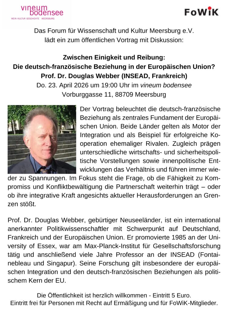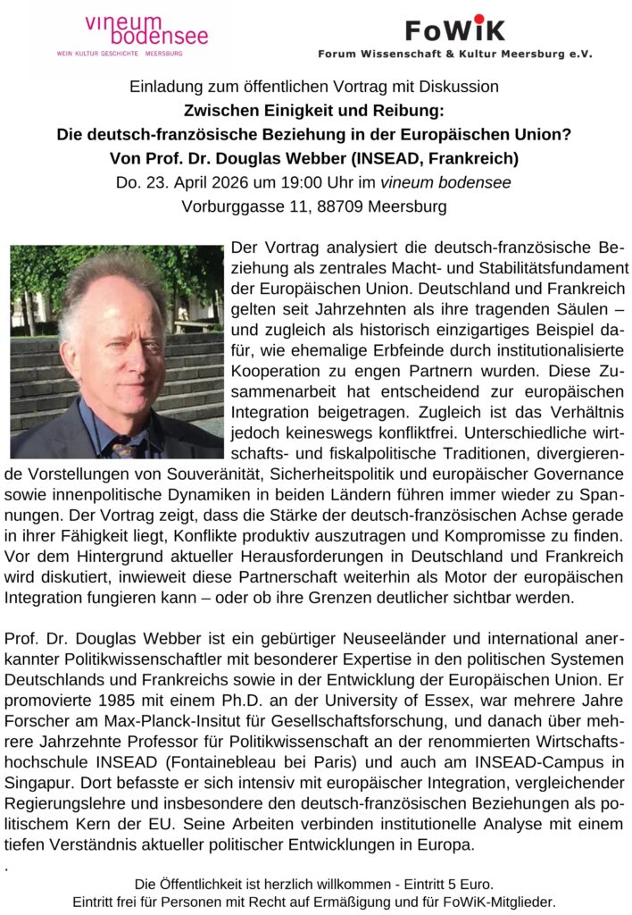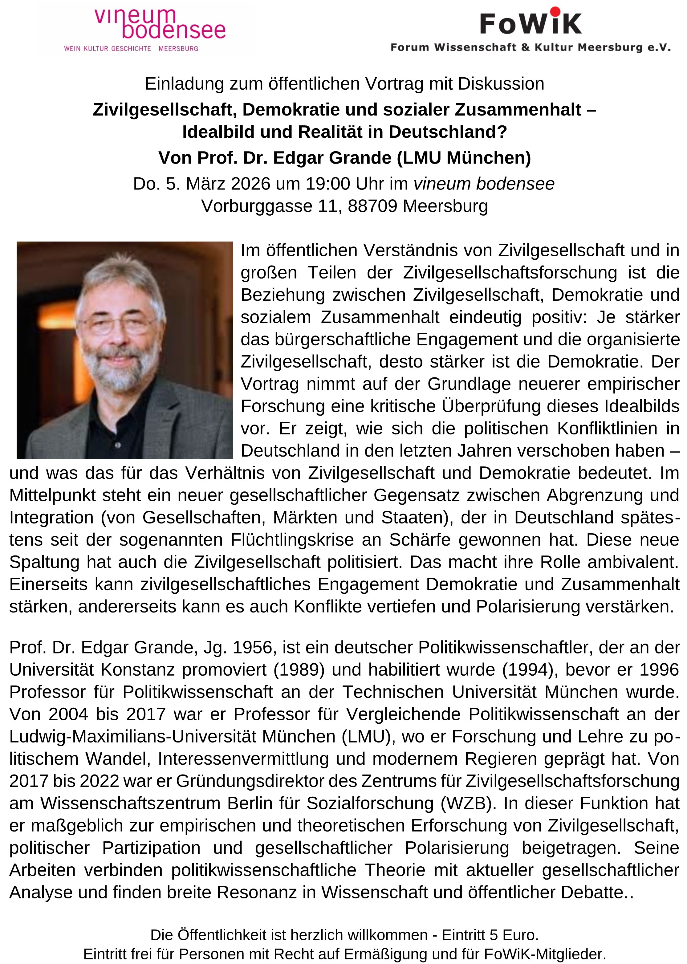 - Zivilgesellschaft, Demokratie und sozialer Zusammenhalt – Idealbild und Realität in Deutschland? Von Prof. Dr. Edgar Grande (LMU München). Do. 7. Mai 2026 | 19:00 Uhr | vineum bodensee. [Plakat]
