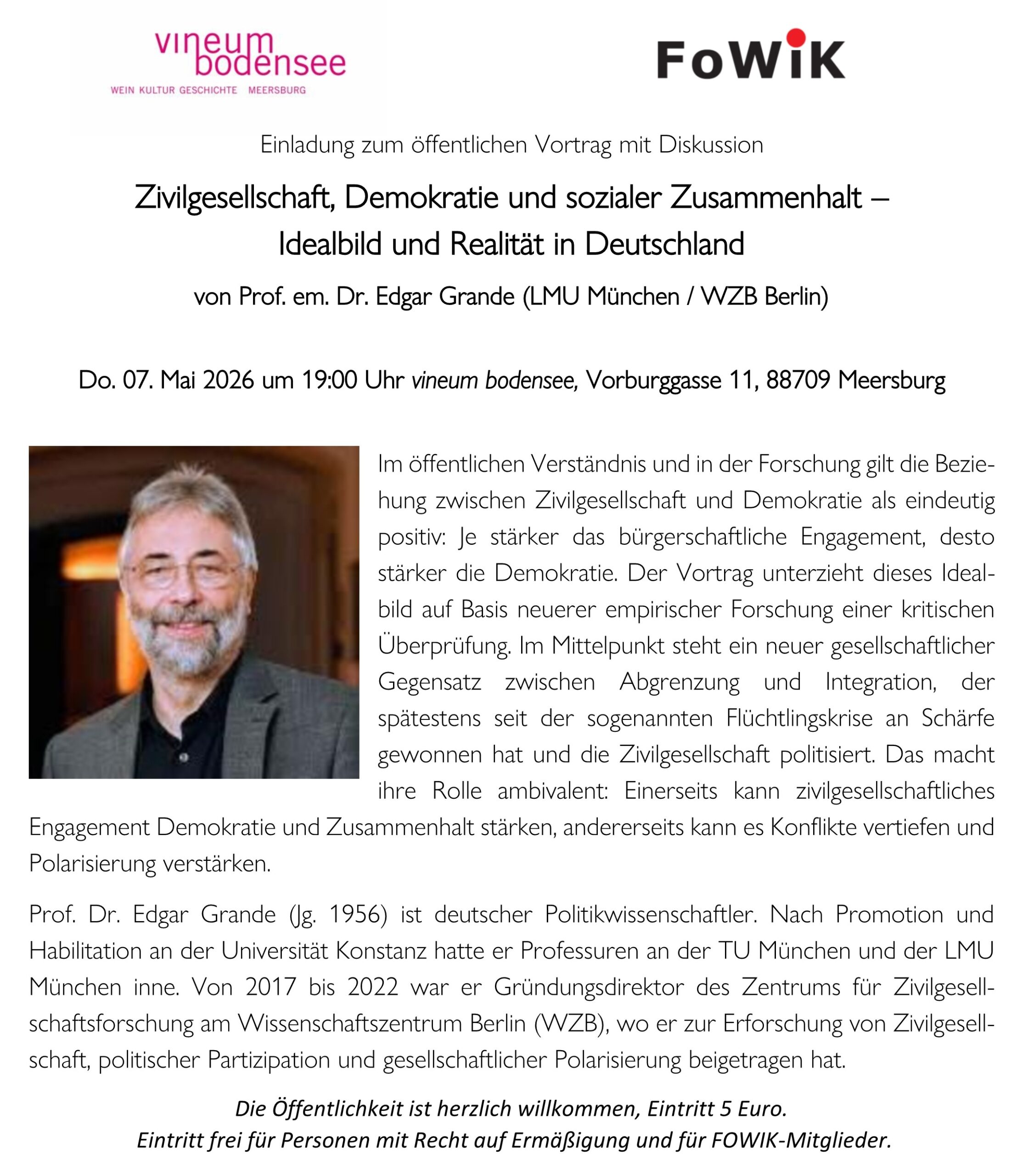 - Welche ‚Politische Kultur‘ braucht unser Land? Von Ulrich Müller (Umweltminister a.D.). Do. 15. Oktober 2026 | 19:00 Uhr | vineum bodensee.