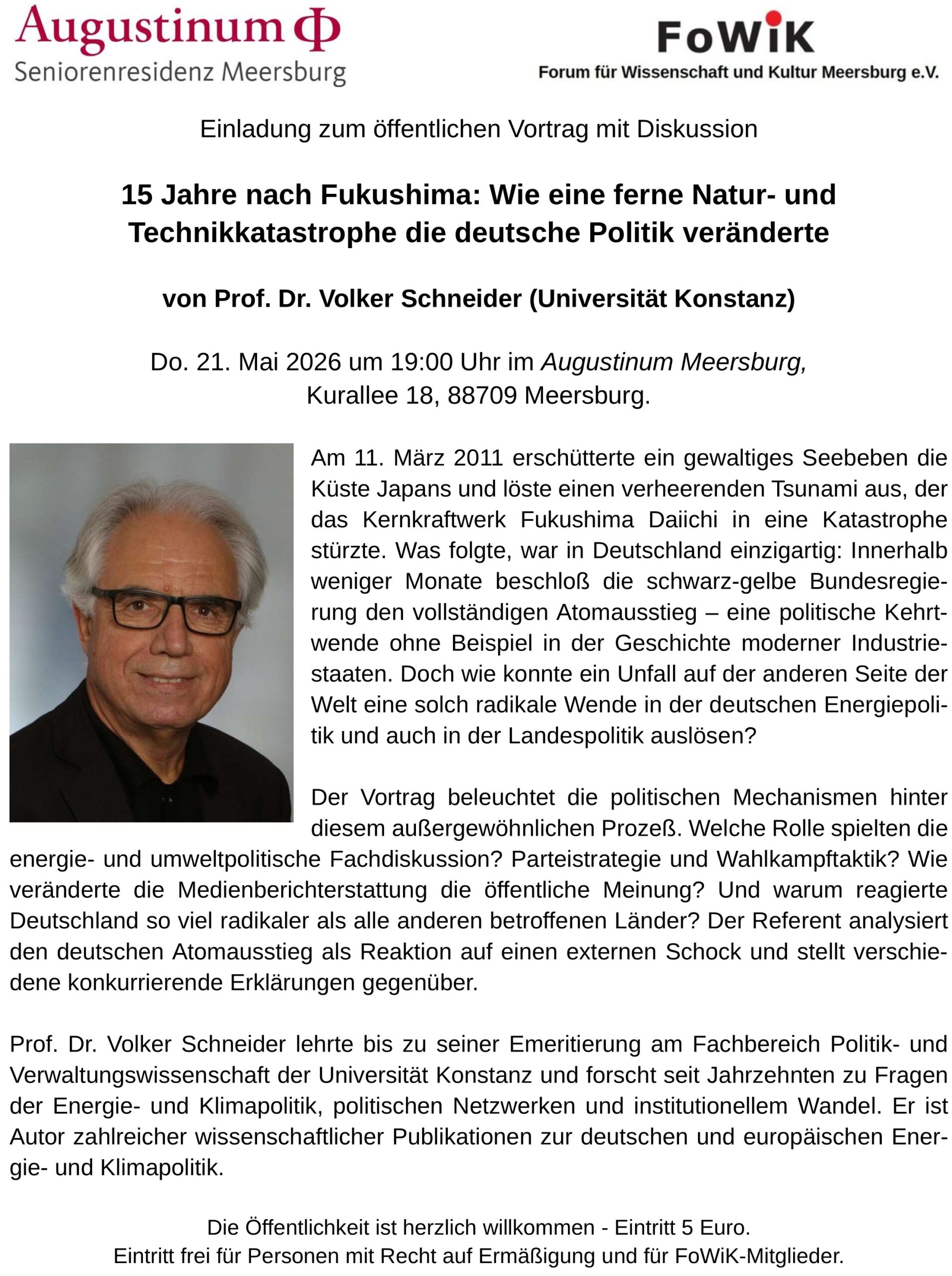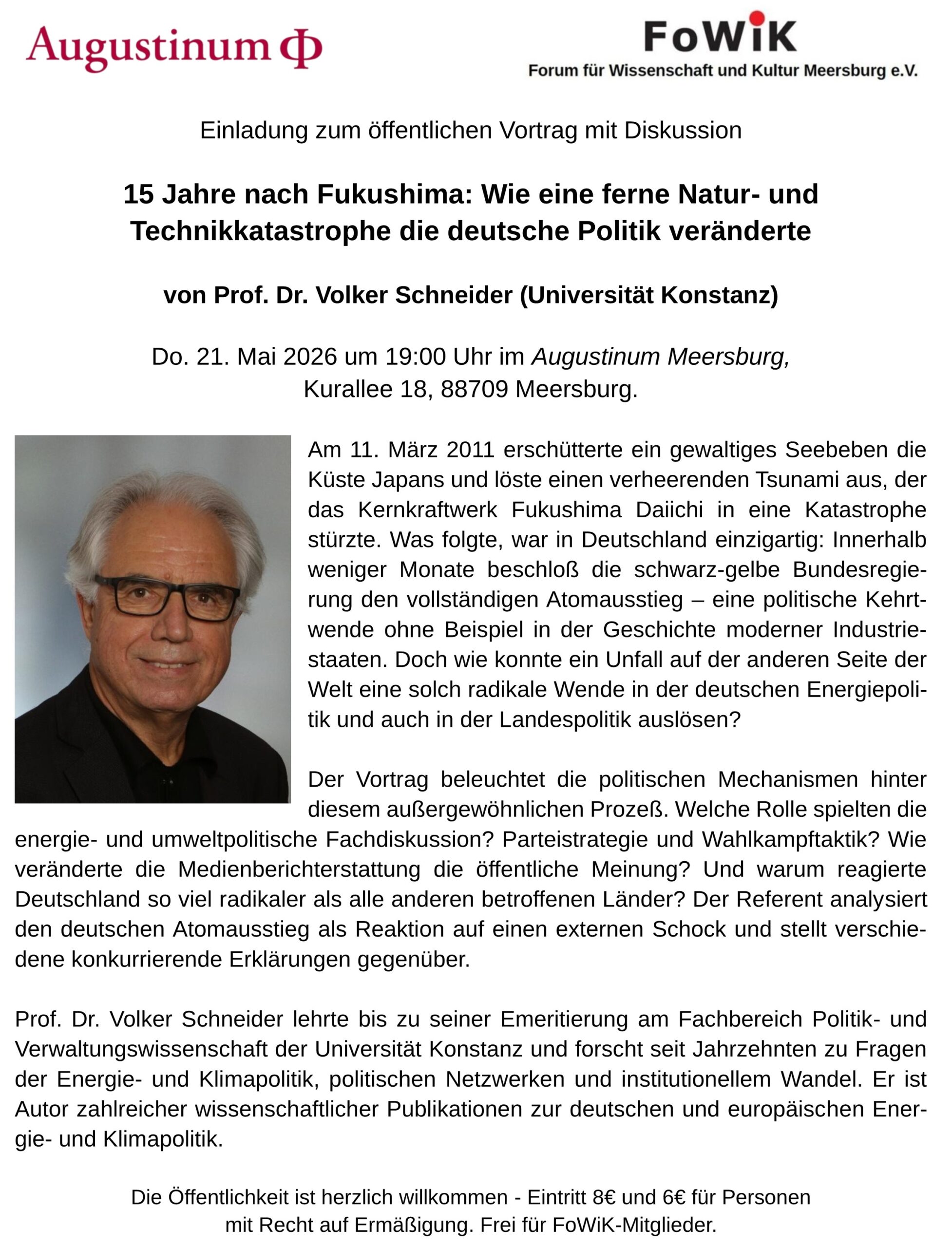 - 15 Jahre nach Fukushima: Wie eine ferne Natur- und Technikkatastrophe die deutsche Politik veränderte. Von Prof. Dr. Volker Schneider (Universität Konstanz). Do. 21. Mai 2026 | 19:00 Uhr | Augustinum Meersburg [Plakat].